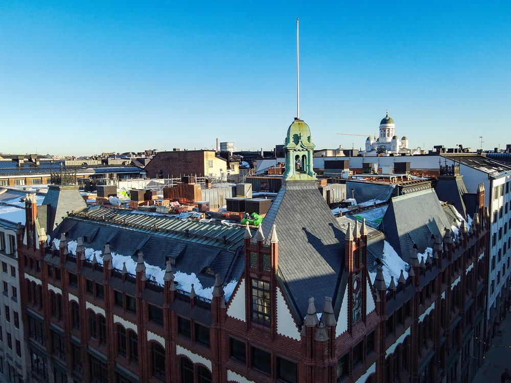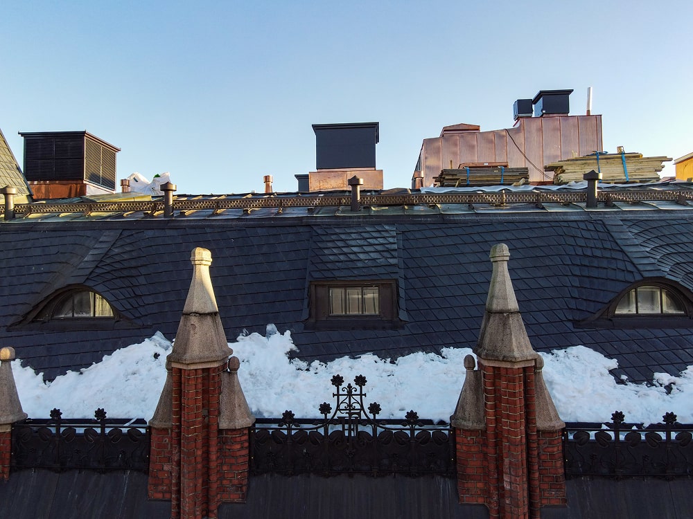 Kattosaneeraus aloitettiin syksyllä 2015 ja se valmistui alkuvuonna 2016. Liuskemestarit Oy toimitti kohteen kivet, toimi teknisenä asiantuntijana ja urakoi asennuksen. Nyt uusi kivipinta kestää varmasti seuraavat 100-vuotta. Suomen ehkä vaativin vesikattosaneeraus saatiin tehtyä aikataulussa.