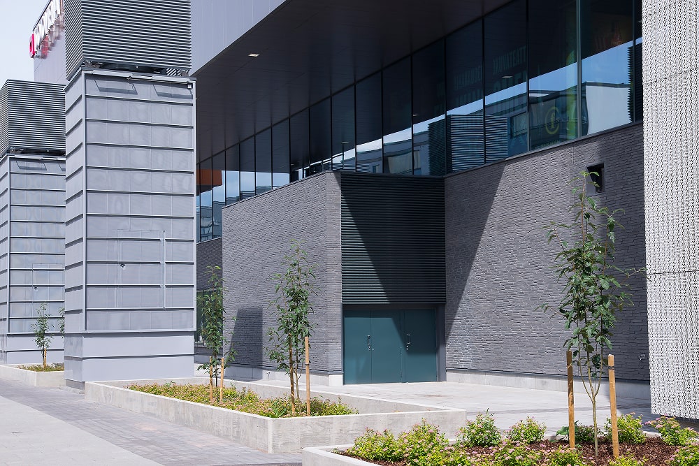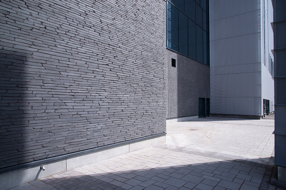 Kuvaus: Ison Omenan laajennuksessa rakennuksen takaosaan luonnonkiviseinä on verhoiltu kotimaisella Sisu Aava -verhoilukivellä. Kasettirunko päällystettiin sementtikuitulevyllä, johon vain 20mm paksut Sisu Aava verhoilukivet liimattiin SS2-saneerauslaastilla.