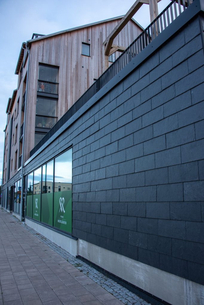 Naantalin sydämesssä sijaitsevan uuden Sigge Arkkitehtien suunnitteleman kerrostalon kiertää Black River -kivipaanuverhoilu.